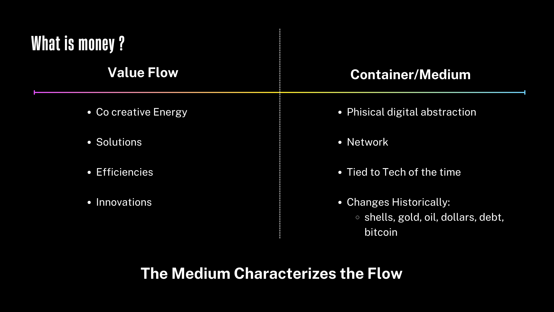 The state of technology and consciousness of a given age determines the characteristics of the medium. (currently transitioning to Bitcoin)